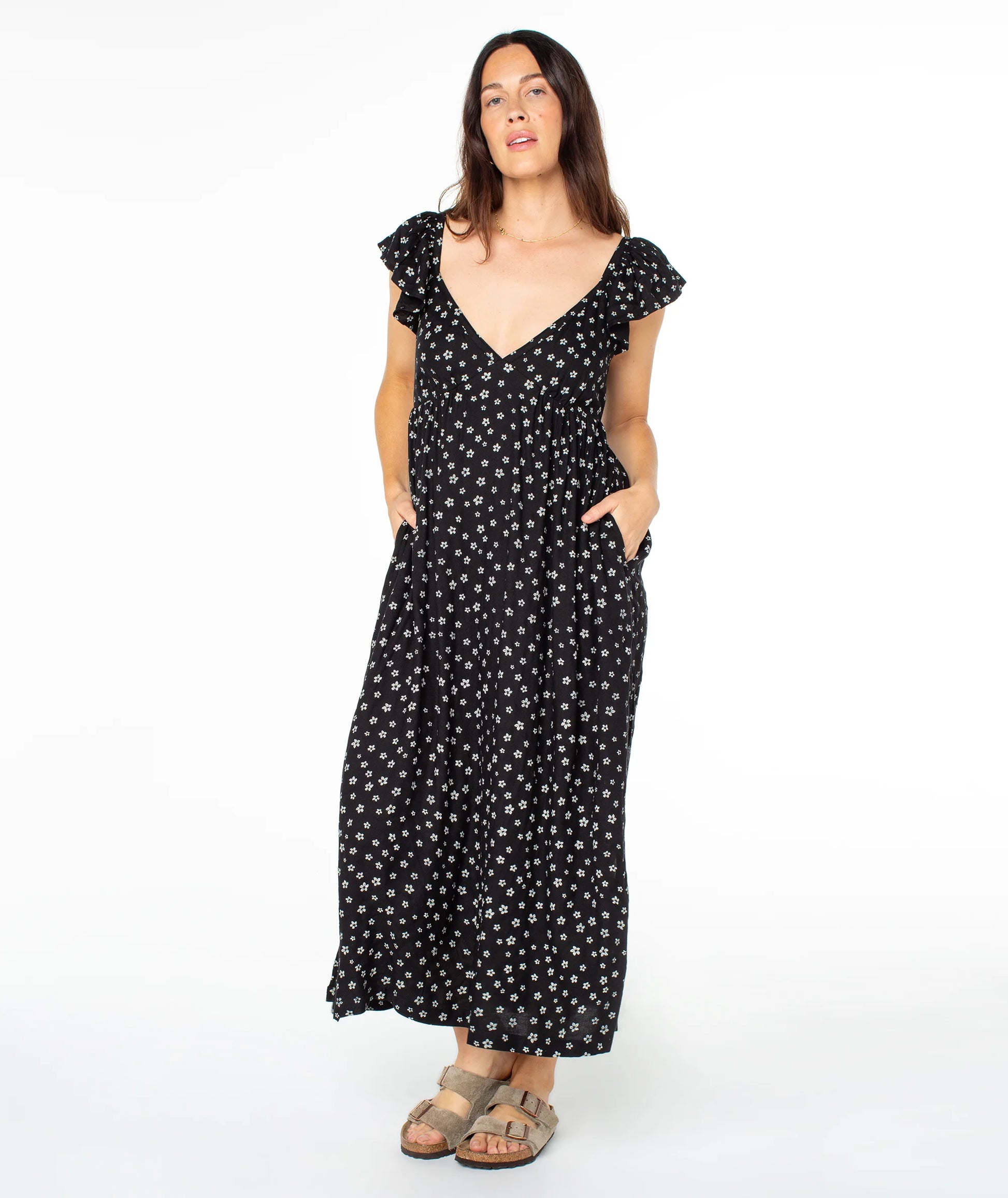 Beachy chic meets laid-back elegance in the Bohemian Nights Midi. Crafted from a breezy viscose, this tiered silhouette features adjustable ruffled shoulder ties and a flattering, fitted bust. Effortlessly romantic and endlessly wearable, it’s made for golden hour moments and easy coastal days.